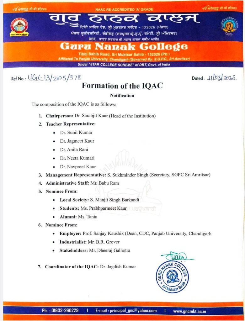 | 1. | Dr. Tejinder Kaur Dhaliwal | Chairperson IQAC | Principal cum Director, Directorate of Education SGPC Amritsar | ![]() |