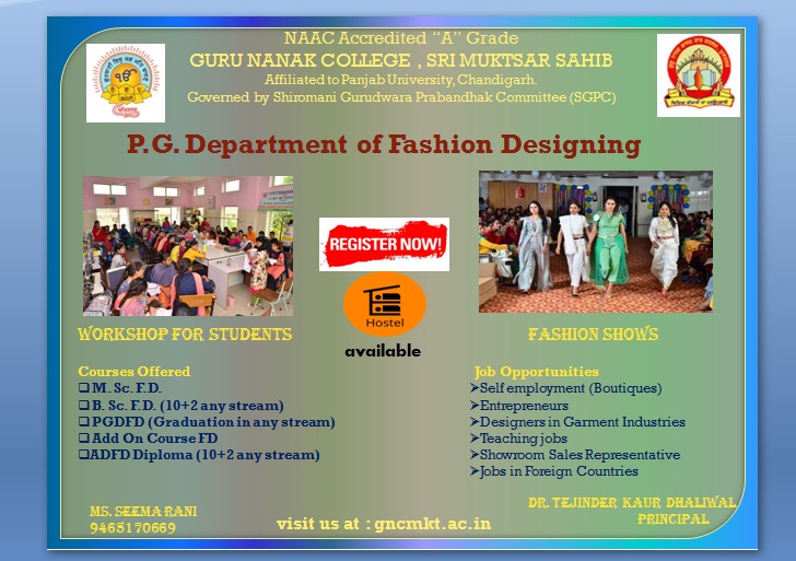 Today’s world is fashion world. Each and everything is affected by fashion. Fashion Designing is one of the important professions today. The course was started in 2006 as Add-on- course. With the changing times the Graduate programme in the discipline was introduced in the year 2009, the educational institution have taken the responsibility to train our young mind in fashion designing and developing entrepreneur skills for future time. It is the theory and practical training course., Fashion Designing is very interesting subject for girls. It is a job oriented course & self employment course. Department of fashion designing, every year organizes workshop, fashion show, extension lecture, industrial visit and industrial training for students.